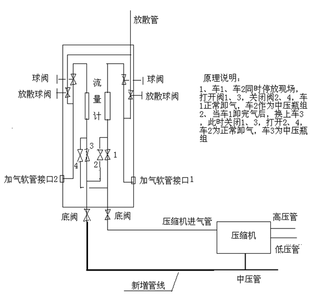 (6) 排氣量隨槽車的壓力變化而變化,當槽車壓力較低時,排氣量也較低,這時如果遇到加氣高峰時則顯得加氣量不足,需要加氣站配儲氣瓶組來調節加氣高峰,更換槽車時同樣可以對外售氣。