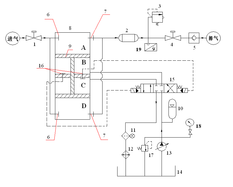 1 球閥、2 冷卻器、3 安全閥、4 球閥、5 單向閥、6 進氣閥、7 排氣閥、8 氣缸、9 活塞、10 蓄能器、11 回油過濾器、12 油冷卻器、13 液壓泵、14 油箱、15 電液換向閥、16 限位開關、17溢流閥、18壓力表、19壓力傳感器。