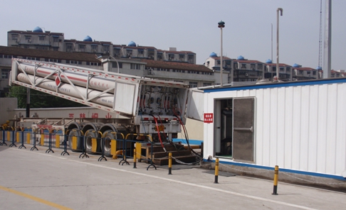 由液壓平推設備系統組成的CNG加氣子站,由專用槽車、液壓工作橇、售氣機等組成。其工作原理是:液壓工作橇提供高壓油,通過一系列控制閥將液壓油注入專用槽車的長管鋼瓶內,將長管鋼瓶內的天然氣以21.5MPA的恒定壓力推出來,再通過售氣機給汽車加氣。當液壓油將長管鋼瓶內的氣體基本置換完后,用剩余氣體的壓力再將油推回油箱,如此反復。如圖三:左邊是專用槽車,右邊是液壓工作撬。