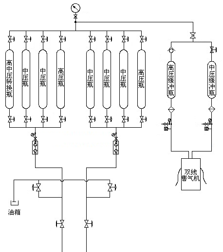 綜上所述,各種液壓壓縮機或液壓系統都有它的優勢和不足。現在,這幾種設備都在專門針自身的不足作相應的技術改進。其中,液壓活塞式壓縮機通過改變加氣站流程來克服自身的不足,采用雙卸氣流程來克服槽車壓力低時排氣量跟不上的弊端。流程圖如圖五:當槽車壓力較低時,可以將另一輛滿的槽車通過低壓線給車加氣,這樣就可以保證任何時候都能正常加氣。但氣液雙缸一體式與油氣缸分開式的最大區別在于后者必須用水冷卻氣缸,增加水系統(增加系統意味著增加故障點),且增加了維修的難度。