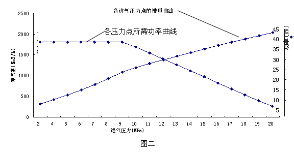 (1) 節能效果好。選用22KW雙電機,進氣壓力(即槽車鋼瓶內壓力)高時為單電機工作,低時為雙電機工作。經第三方檢測,實測平均售氣量1000方/小時的情況下,平均每方氣的耗電量為0.035度電。圖二是槽車壓力各壓力點的排量與功率曲線: