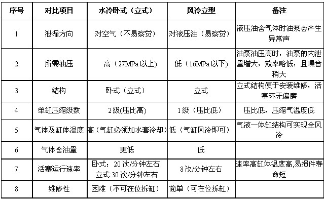 三、全風(fēng)冷立式氣液一體缸與水冷氣液分體缸臥式(立式)液壓活塞壓縮機(jī)綜合比較如下: