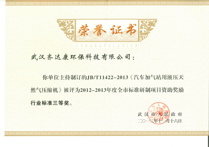 10月l4日,是世界標準日。昨日上午,市質量技術監督局、漢陽區質監局聯合開展的一系列服務活動中,武漢齊達康環保科技有限公司被請上了主席臺,全國壓縮機技術標準委員會發來通知,正式下達《天然氣汽車加氣站用液壓壓縮機》的行業標準,該標準采用的正是齊達康制訂的液壓壓縮機技術標準。