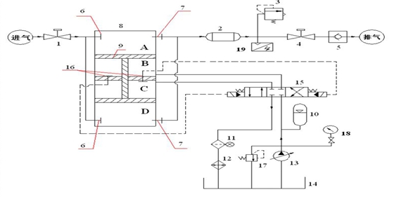 液壓站輸出的高壓油進入 C 腔, B 腔的油回油箱(近似認為回油箱的油壓力為0),活塞桿向下運動,槽車內氣體進入 A 腔(一級進氣),而 D 腔的氣體則經壓縮后流出(一級壓縮),進入冷卻器,完成一級壓縮過程;當活塞運行到極點時,液壓站換向閥將會換向,輸出的高壓油進入 B 腔, C 腔的油回油箱,活塞桿向上運動,槽車內氣體進入 D 腔(一級進氣),而 A 腔的氣體則經壓縮后流出(一級壓縮),進入冷卻器,完成一級壓縮過程。