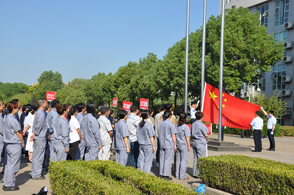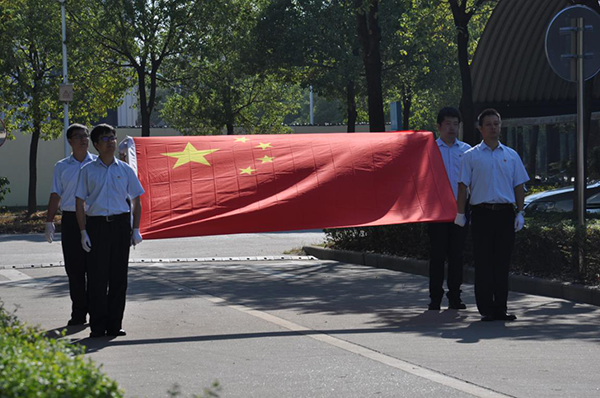 升旗儀式現場,全體職工整齊列隊,英姿颯爽的國旗護衛隊護衛鮮艷的五星紅旗入場。伴隨著激昂的義勇軍進行曲,五星紅旗迎著朝陽徐徐升起,全體人員行注目禮,整個儀式莊嚴、隆重。