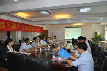 鄒總一行首先參觀了齊達康公司生產總裝車間,然后在公司會議室聽取了齊達康公司總經理唐廣洲詳細介紹了液壓活塞式壓縮機的性能特點、科技創新、行業優勢等,并簡要匯報了齊達康公司目前的經營狀況、發展目標及規劃。