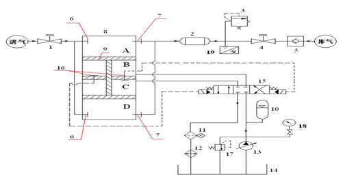 結構原理:工字形活塞桿將上面氣缸分隔為A、B兩個腔,將下面氣缸分隔為C、D兩個腔,如上圖: