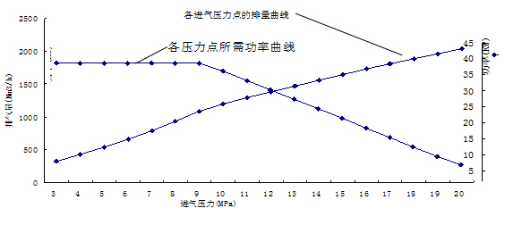 特點:節能效果好。一般選用22kW雙電機,進氣高時為單電機工作,低時為雙電機工作。下圖是槽車壓力各壓力點的排量與功率曲線: